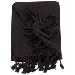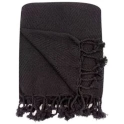 Fouta, jeté de lit, plaid 100% coton 120 x 150 cm avec franges jacquard motif chevrons ton sur ton noir. Une fouta coton au motif chevrons passe-partout grâce à sa couleur noble.
