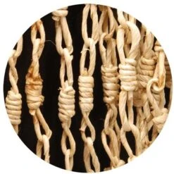 Rideau de porte à lanières de feuille de maïs, monté sur un rail bois.