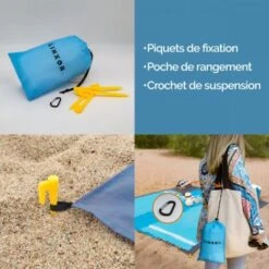 Le tapis de plage est fourni avec 4 piquets de plage, une pochette de rangement et un mousqueton pour l’accrocher aisément.